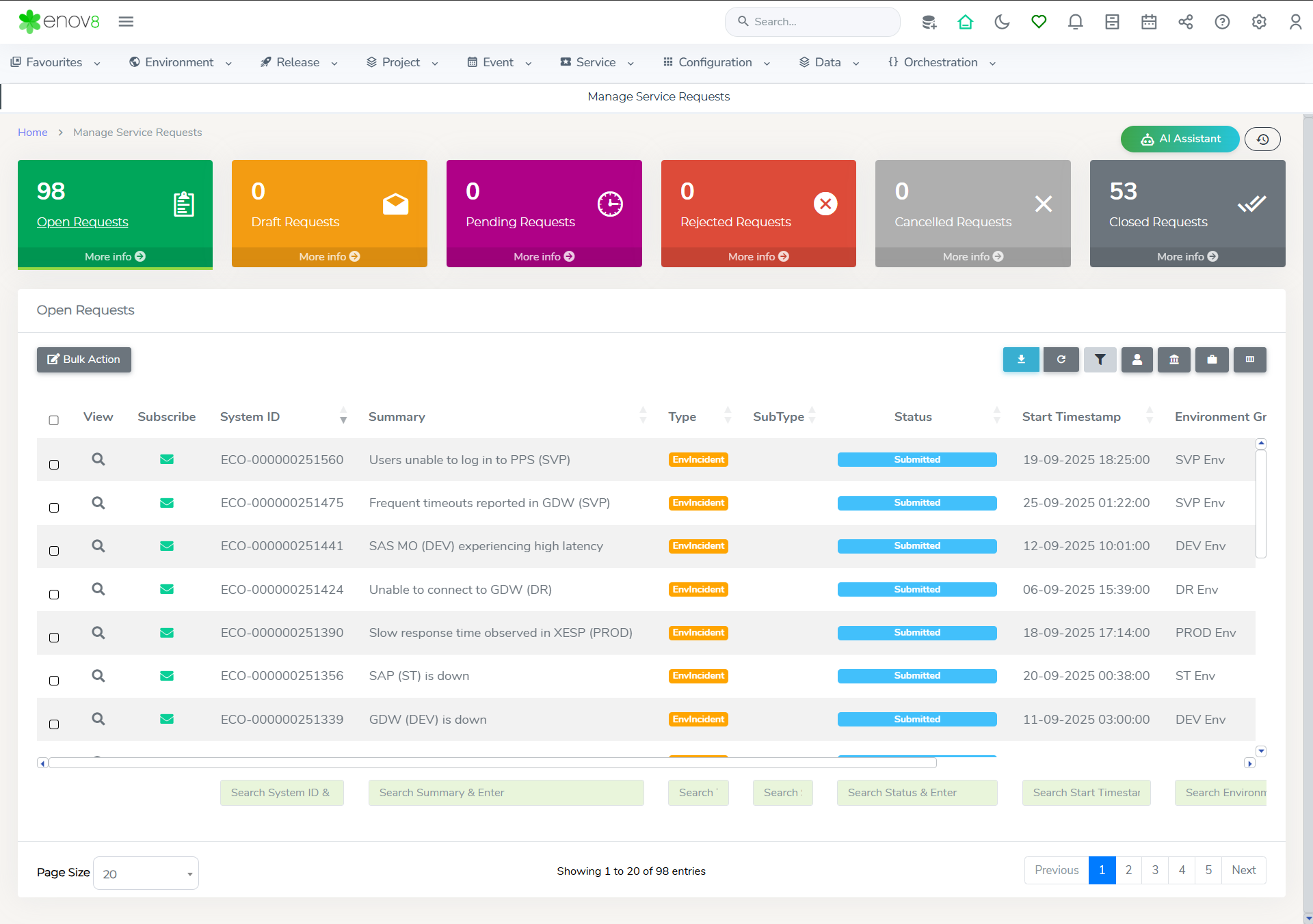 This structured approach to managing service requests ensures that users can track, manage, and action all requests effectively, maintaining oversight of service management processes within the Enov8 platform.