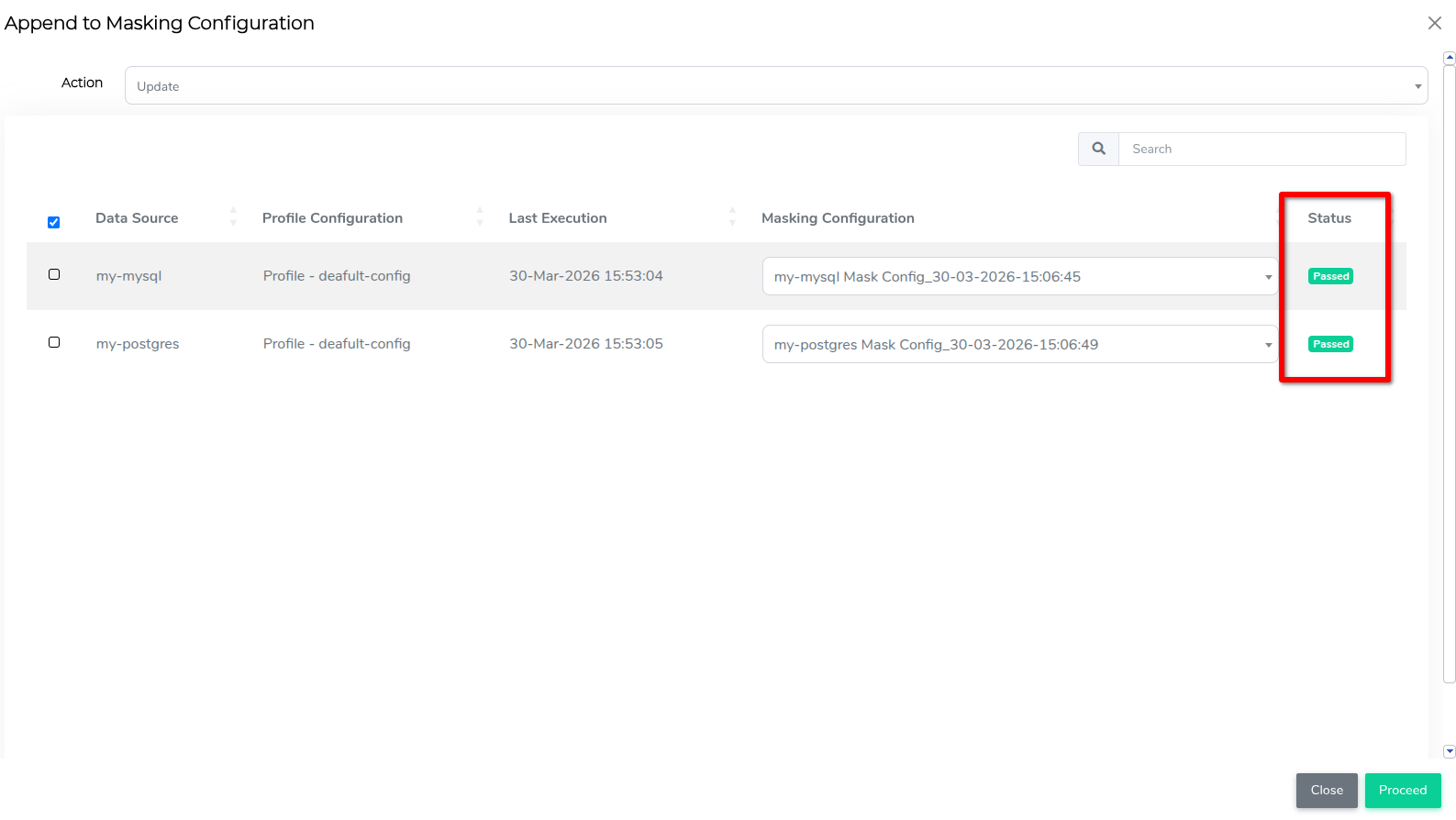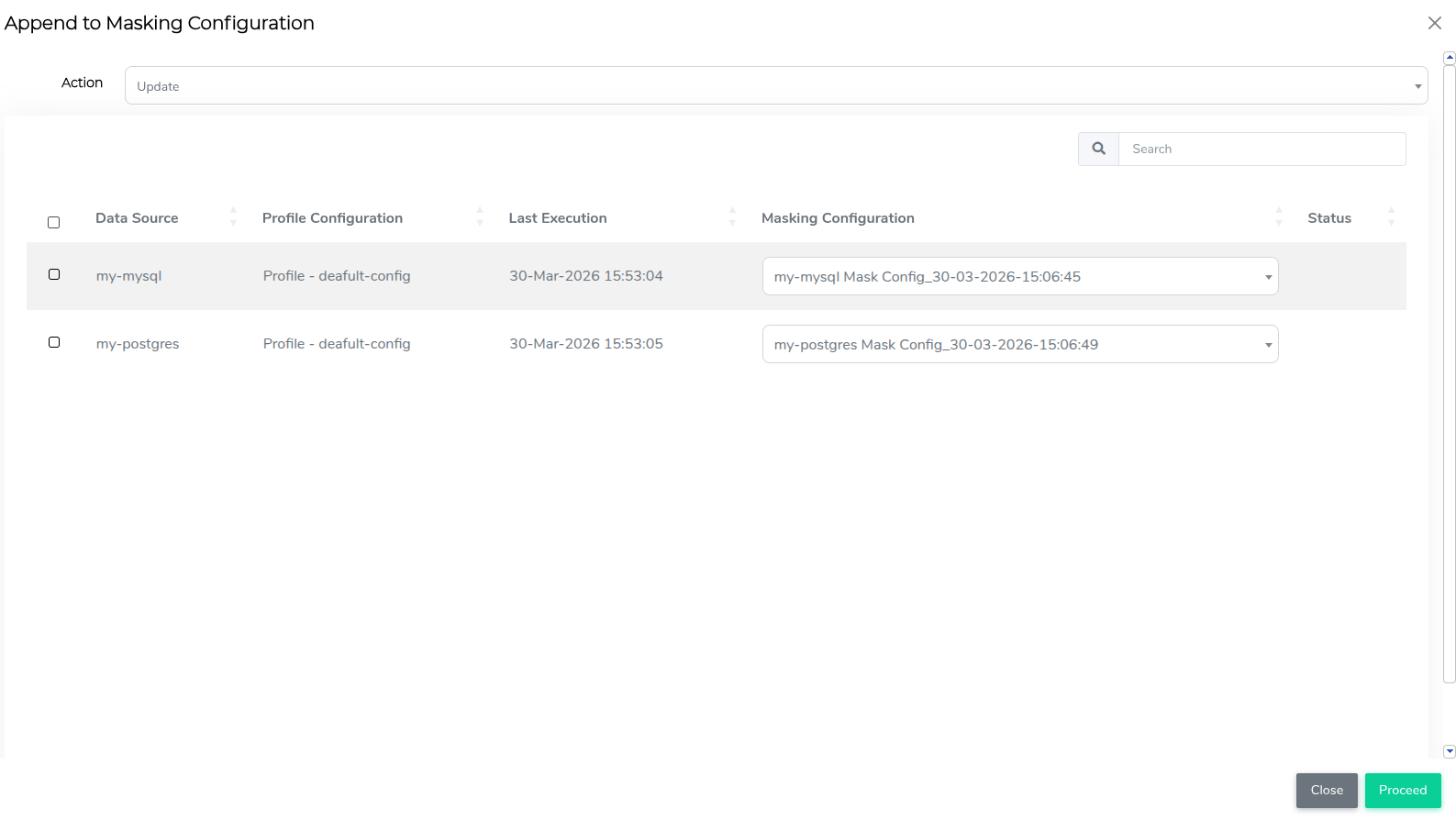 If you choose Create, default masking configuration names appear in the Masking Configuration column of the modal, and you can manually enter new names. If you choose Update, select existing masking configurations from the drop-down list in the Masking Configuration column.