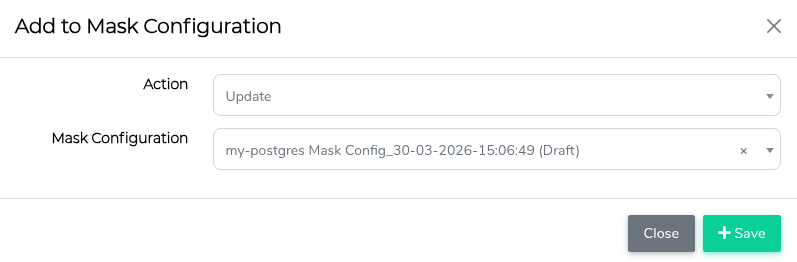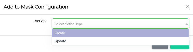 The Add to Mask Configuration modal appears. From the Action drop-down list, choose Create to create a new masking configuration, or Update to modify an existing one.