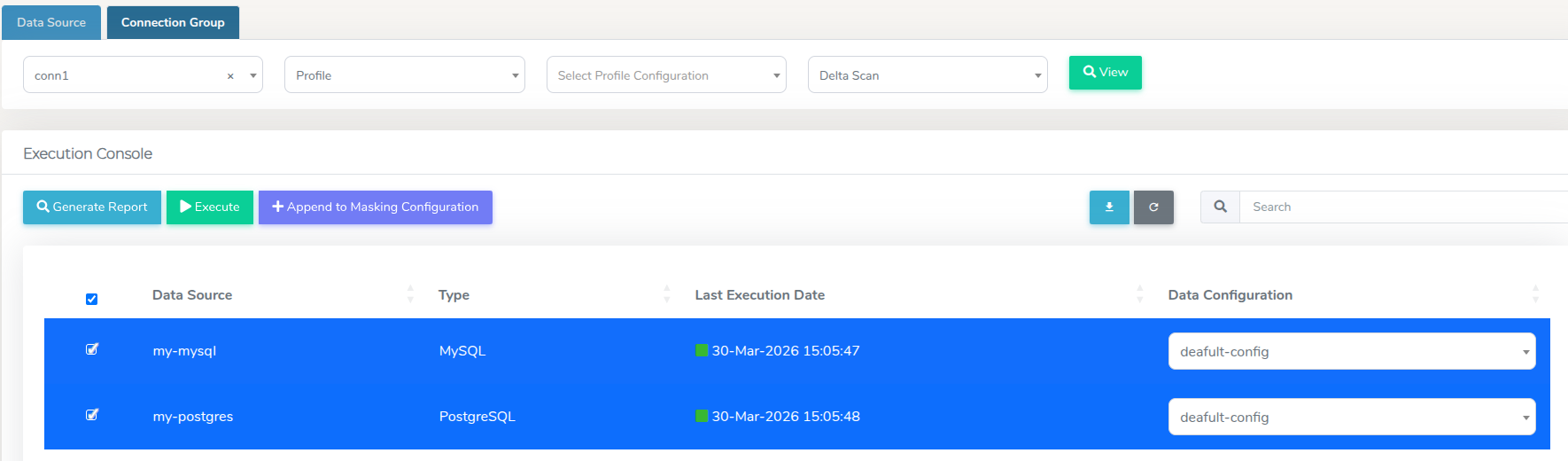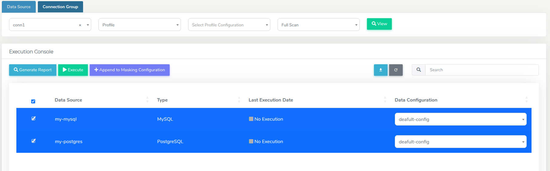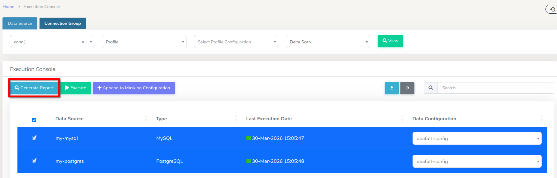 In order export the reports in bulk, navigate to the Execution Console section in the Connection Group tab, and select the data sources to include in the bulk report.